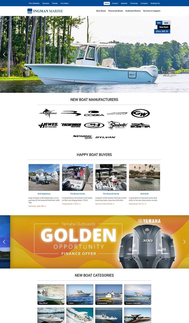 Besides rebuilding the website and linking it to Dealership Tools, the secondary focus was on rebranding the social media accounts and increasing online followers. We concentrated on brand strategy, Account-Based Marketing (ABM), creating various media, and other marketing disciplines to attract local viewers who were already familiar with Ingman's brand. After focusing on and reorganizing the online brand, we worked with Ingman to leverage their sales team to better understand user behavior and incoming leads by asking them to speak with people entering the dealerships. We worked with management and sales teams and orchestrated a pay-per-click campaign on Google Ads and Facebook to reach new boat buyers.